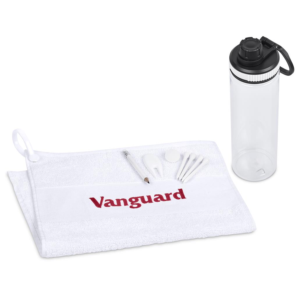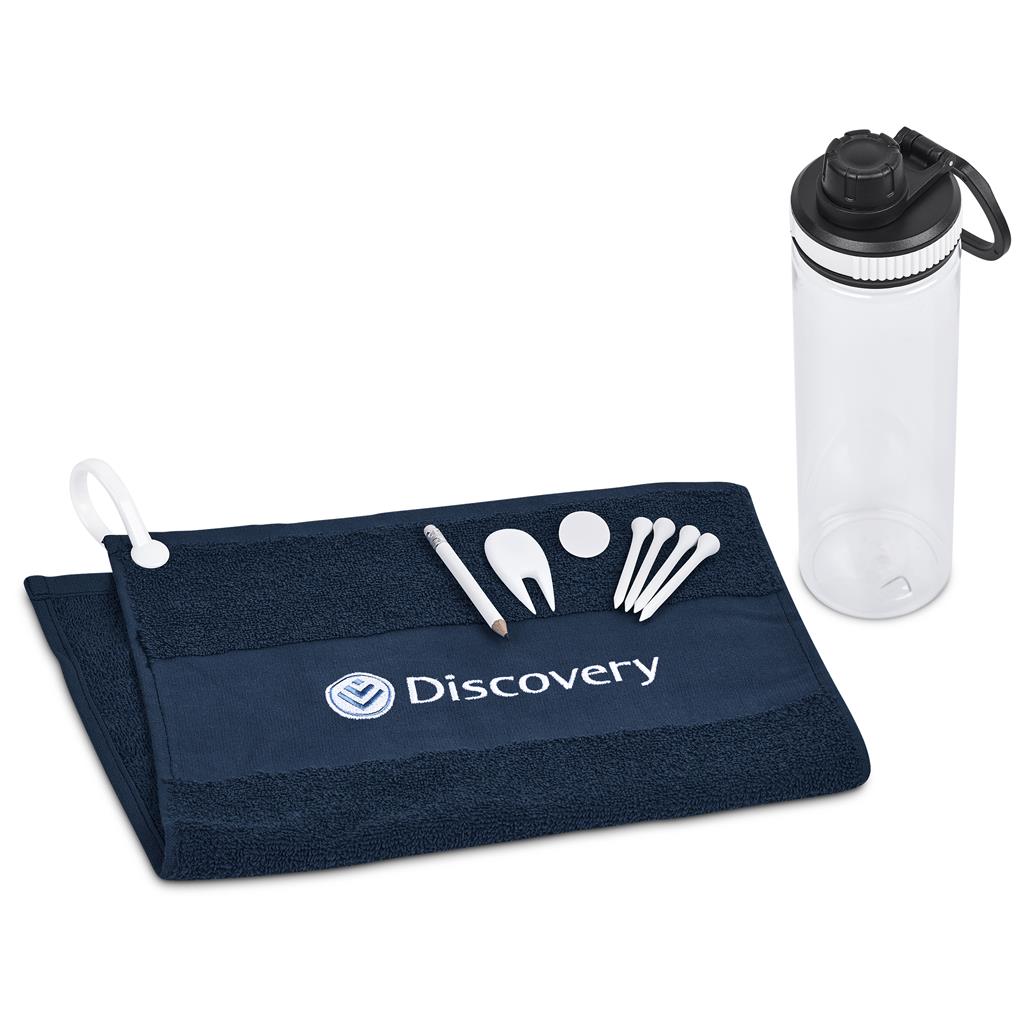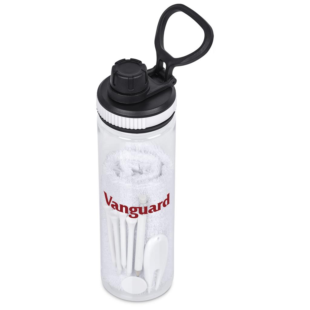 Tee off in style, with hydration and golf essentials in one package. This reusable water bottle comes supplied with a soft golf towel and handy golf accessories packed inside. Great for hydration and convenience on the course, it offers excellent branding opportunities on both the bottle and towel. A must-have promotional gift for golf days, country clubs, and corporate golf events.
