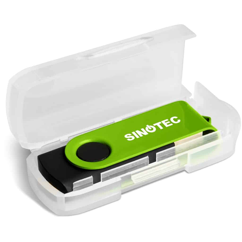 Classic flash drive with a black, soft-touch, lacquered base and a metal swivel in a choice of colours. It has 4GB of memory, with a USB 2.0 interface. Presented in a transparent case.